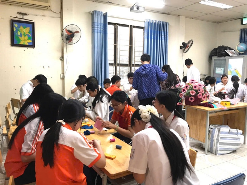 Các em đang dần nắm bắt được kỹ năng làm hoa vải.