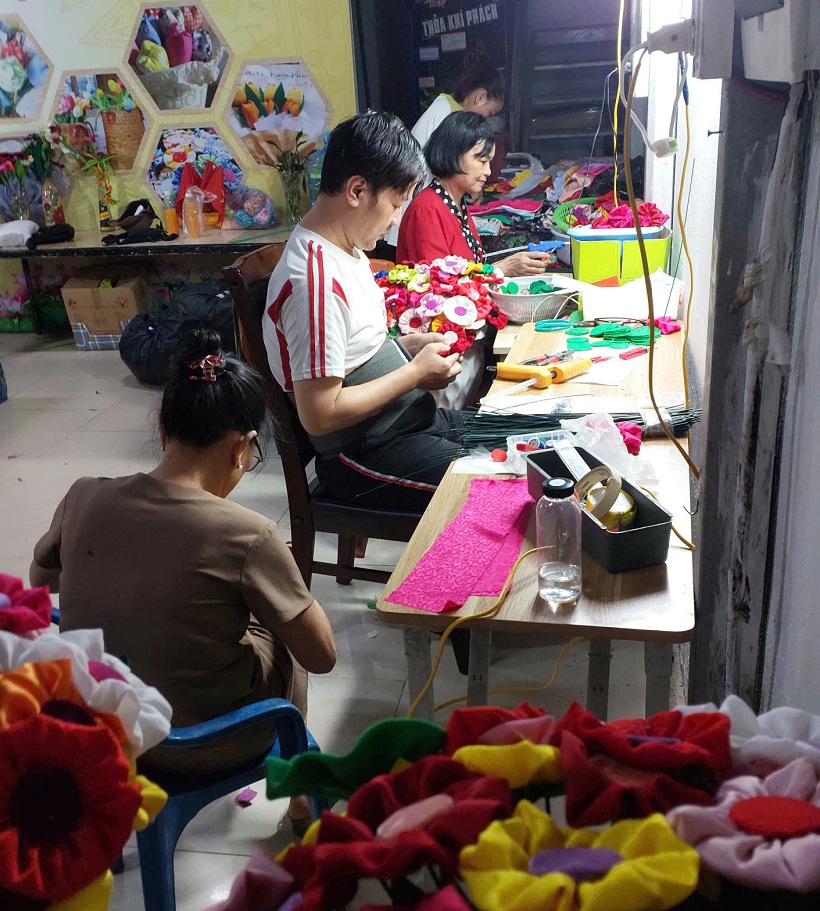 Thế là tất cả Trung tâm đều tất bật, ồn ào hẳn lên. Mọi người ai cũng sắn tay áo lên làm việc một cách say sưa, hoạt động hầu như hết công suất. Trung tâm phân công nhau, người thì chọn lựa vải, dùng máy khâu để cắt may khâu vá, người thì dúng kéo, keo dán, kim chỉ để làm nhụy, đế hoa, người khác lại tỉ mỉ khâu vá để làm ra những cánh hoa tươi thắm…