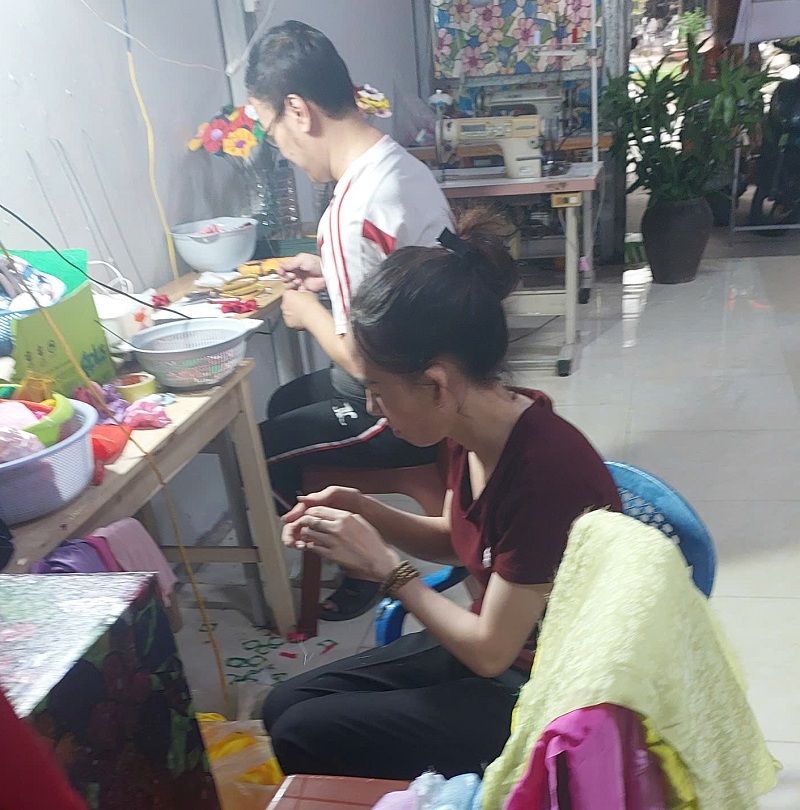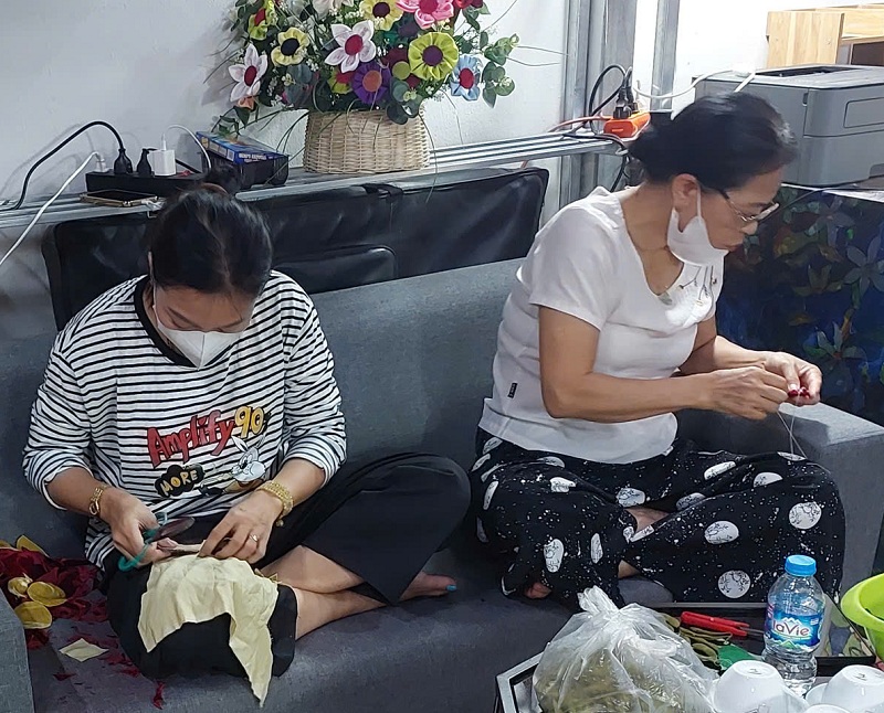 Như thế còn chưa đủ, trung tâm còn huy động thêm người để “chi viện”, những người này cũng hòa vào không khí chung, ra sức cắt may, khâu vá để góp phần làm ra những bông hoa thật tươi thắm. Ai cũng chịu khó, cố gắng để những bông hoa làm ra kịp tiến độ. Không khí thật khẩn trương nhộn nhịp, kéo dài mấy ngày liền không dứt…