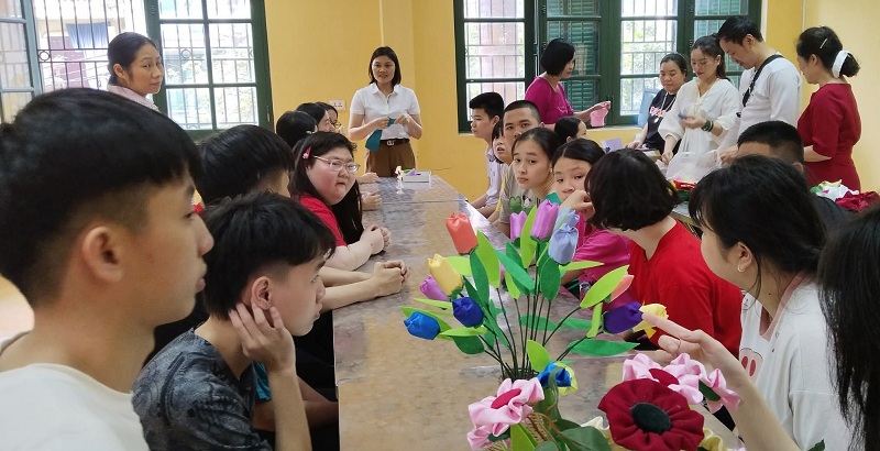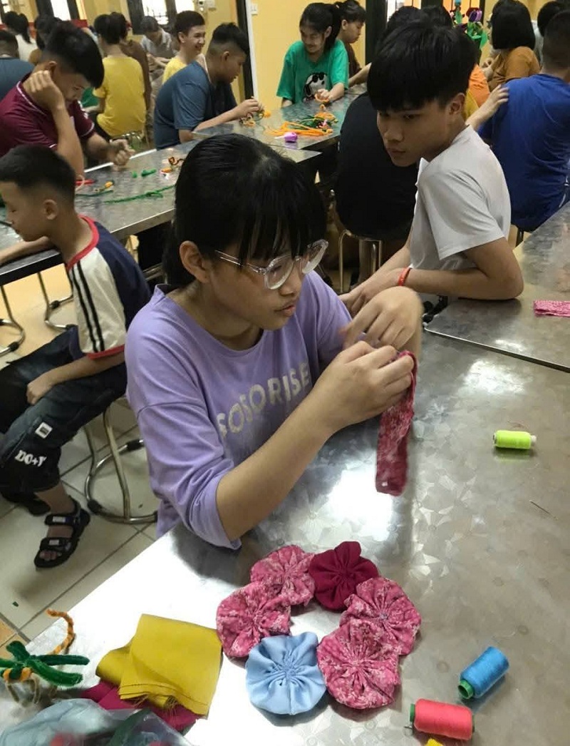 Các cháu khuyết tật làm hoa trong lớp dạy làm hoa vải