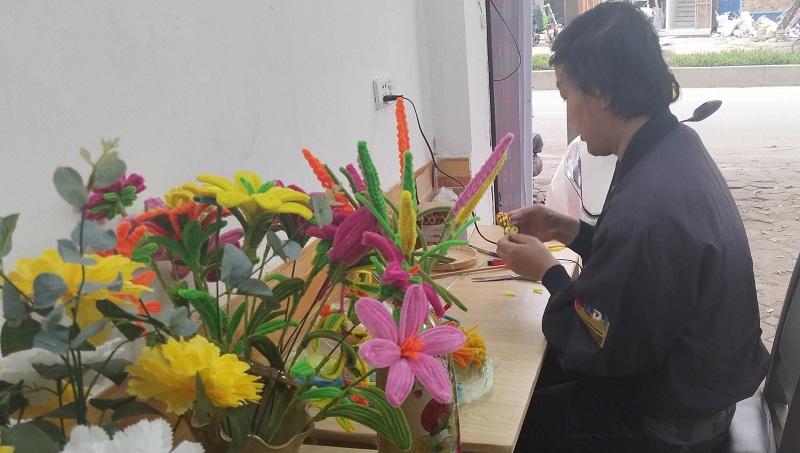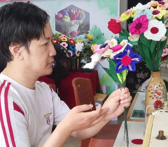 Nghệ Nhân Triiệu Văn Tiến với những bông hoa mà anh đang hoàn thiện.