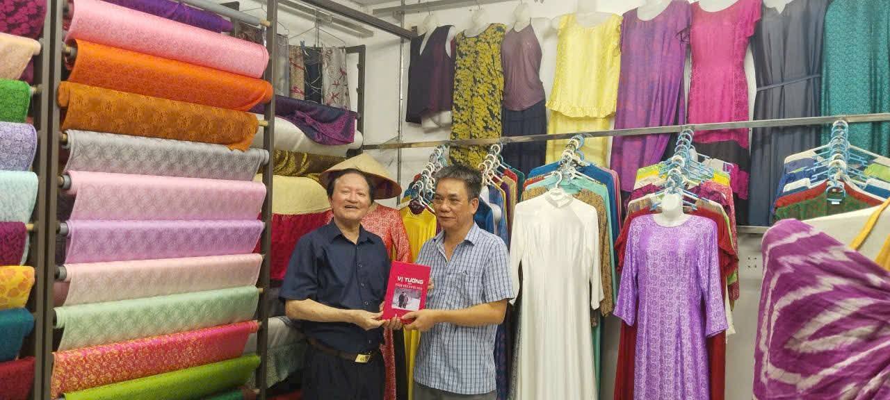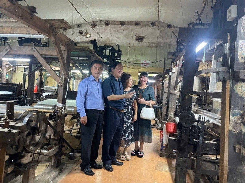 Nghệ nhân Triệu Thị Tâm tiếp Thượng tướng Nguyễn Huy Hiệu tại cơ sở dệt lụa của Nghệ nhân Triệu Văn Mão